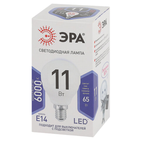 Лампа светодиодная ЭРА STD, 11 (100) Вт, цоколь E27, шар, холодный белый свет, 35000 ч., LED P45-11W-860-E27, Б0032991