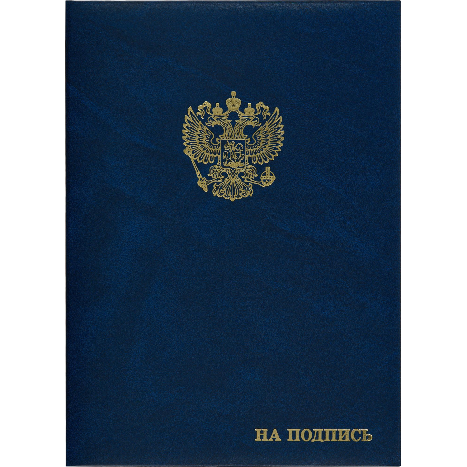Папка адресная На подпись А4 синяя. Предназначена для подачи документов на подпись руководителю. Благодаря строгому дизайну она подойдет для использования в государственных учреждениях, ведомствах и корпоративной среде. Адресная папка формата А4 изготовлена из бумвинила синего цвета (слой ПВХ на бумажной основе). Изображение российского герба и надпись нанесены методом тиснения золотой фольгой. Внутри предусмотрена ленточка для фиксации бумаг. Размер корешка папки составляет 18 мм. Один сантиметр корешка вмещает до 100 листов обычной 80-граммовой бумаги. Папка поставляется в пакете.